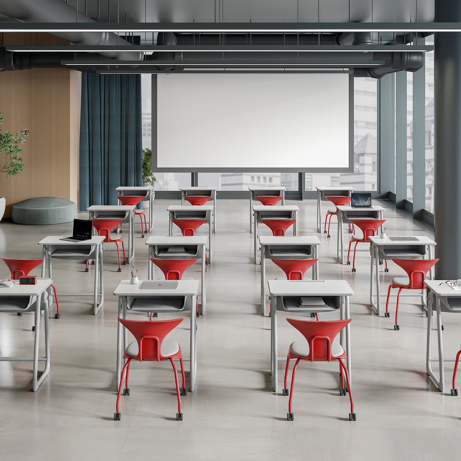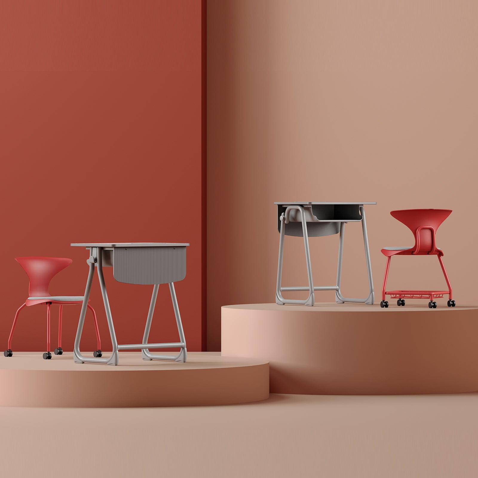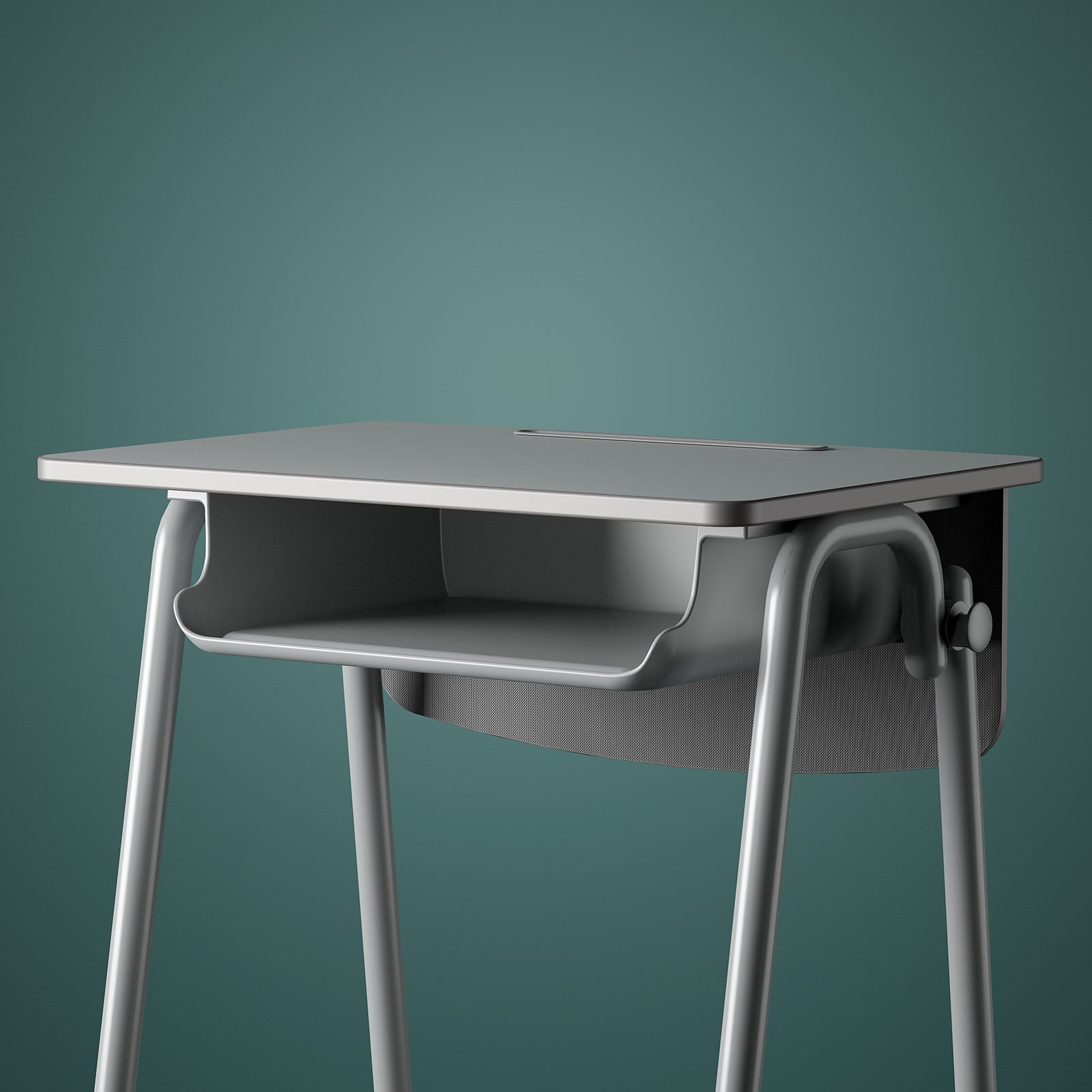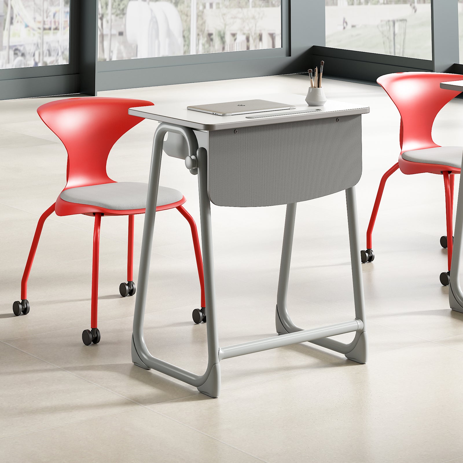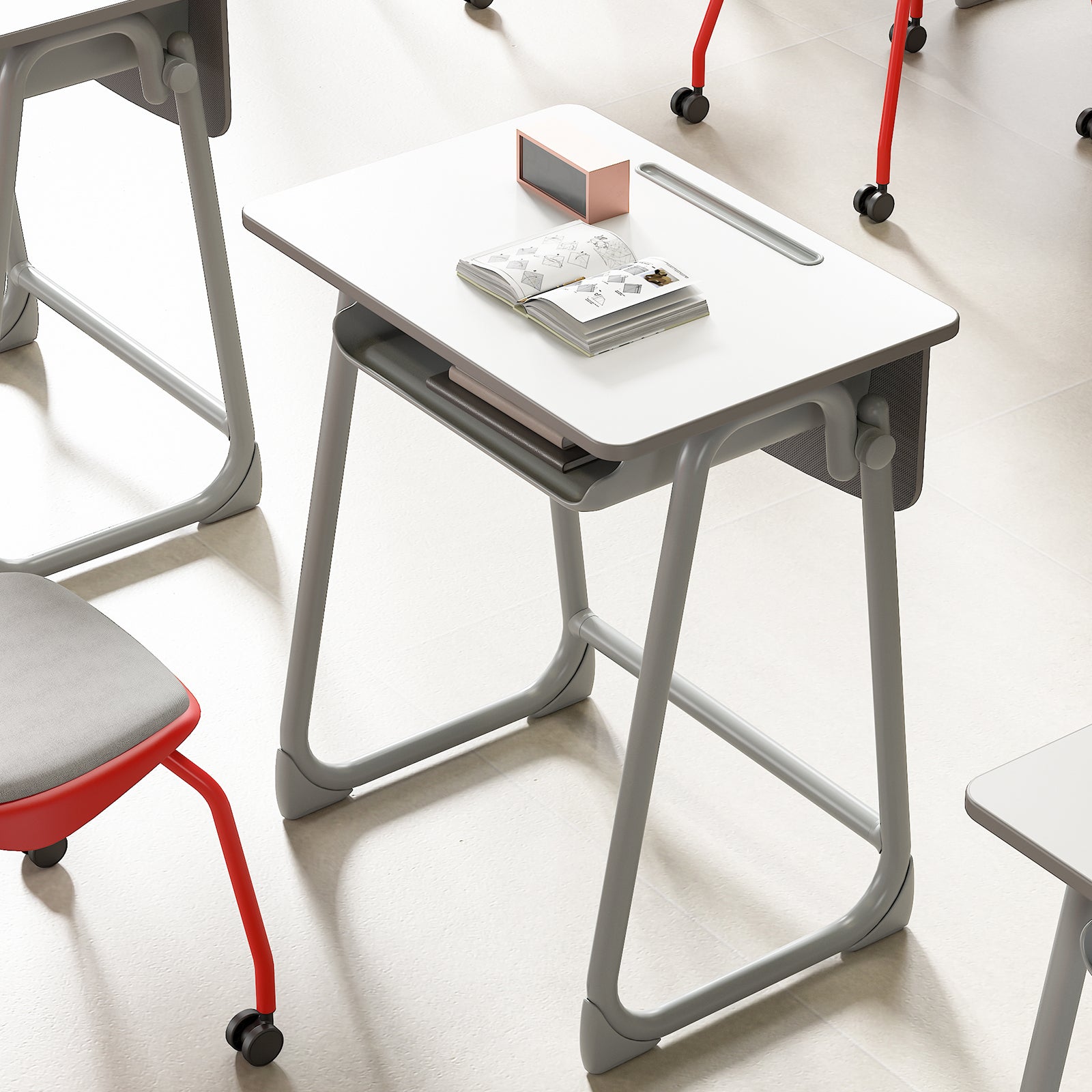 The drawer is made of plastic that can bend easily. It has smooth, rounded edges to keep it safe and prevent accidents like bumps. This helps create a safe and healthy learning space for students. - Hooks: Big hooks on each side for hanging bags.