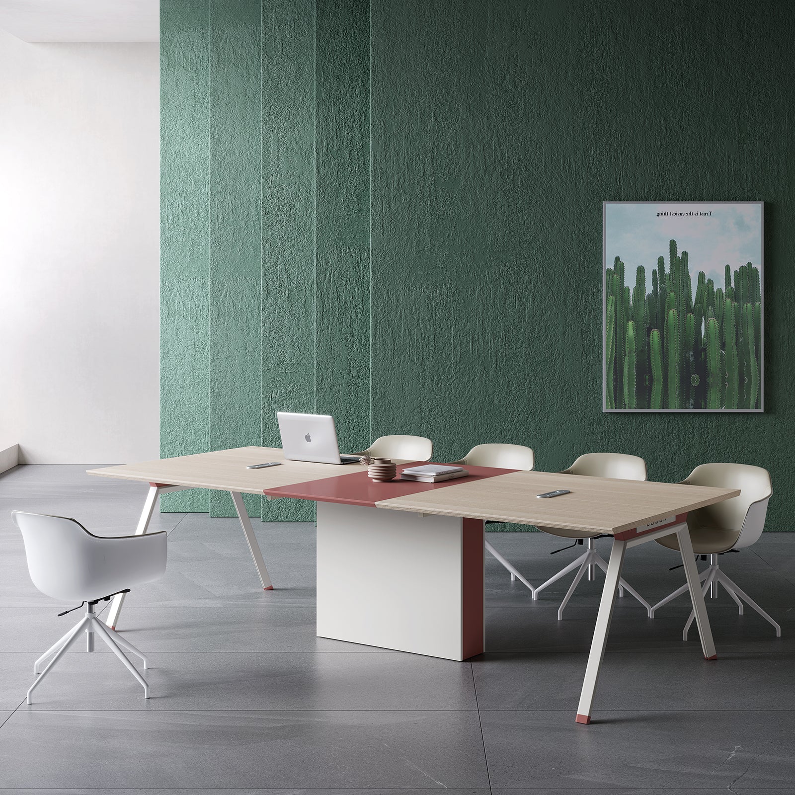 - This conference table boasts a clean, minimalist design that complements any modern workspace. Its elegant lines and finish exude a professional and sophisticated atmosphere.