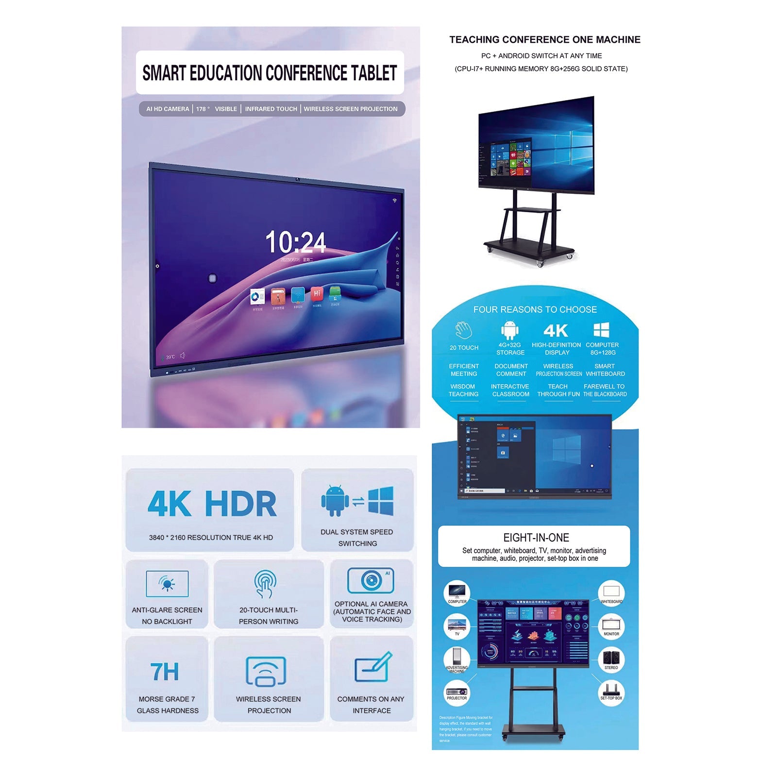- 【All-In-One Hub for Collaboration】With a 4K HD touchscreen, 4-core Cortex processor, and 10 touchpoints with 2mm recognition, multiple users can write simultaneously for seamless collaboration on this smart board. It also features a built-in premium speakers, and microphone to deliver a superior conferencing experience.