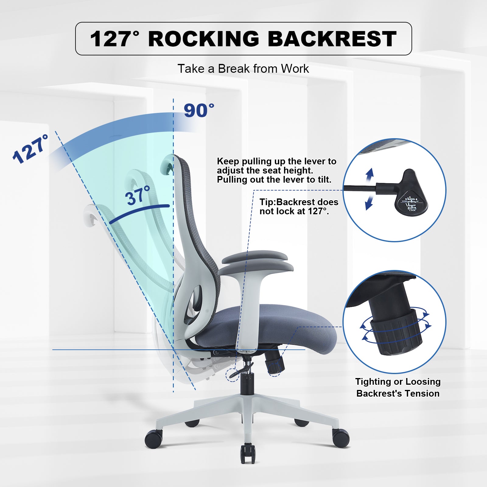 - 【Flexible Adjustment】Tilt the chair smoothly from 90°–127°, providing you with the freedom to stretch and relax your body throughout the day (Note: Backrest does not lock). With a lumbar support that is height-adjustable by 2″, experience ergonomic bliss tailored to your needs, enhancing productivity and well-being during your workday.