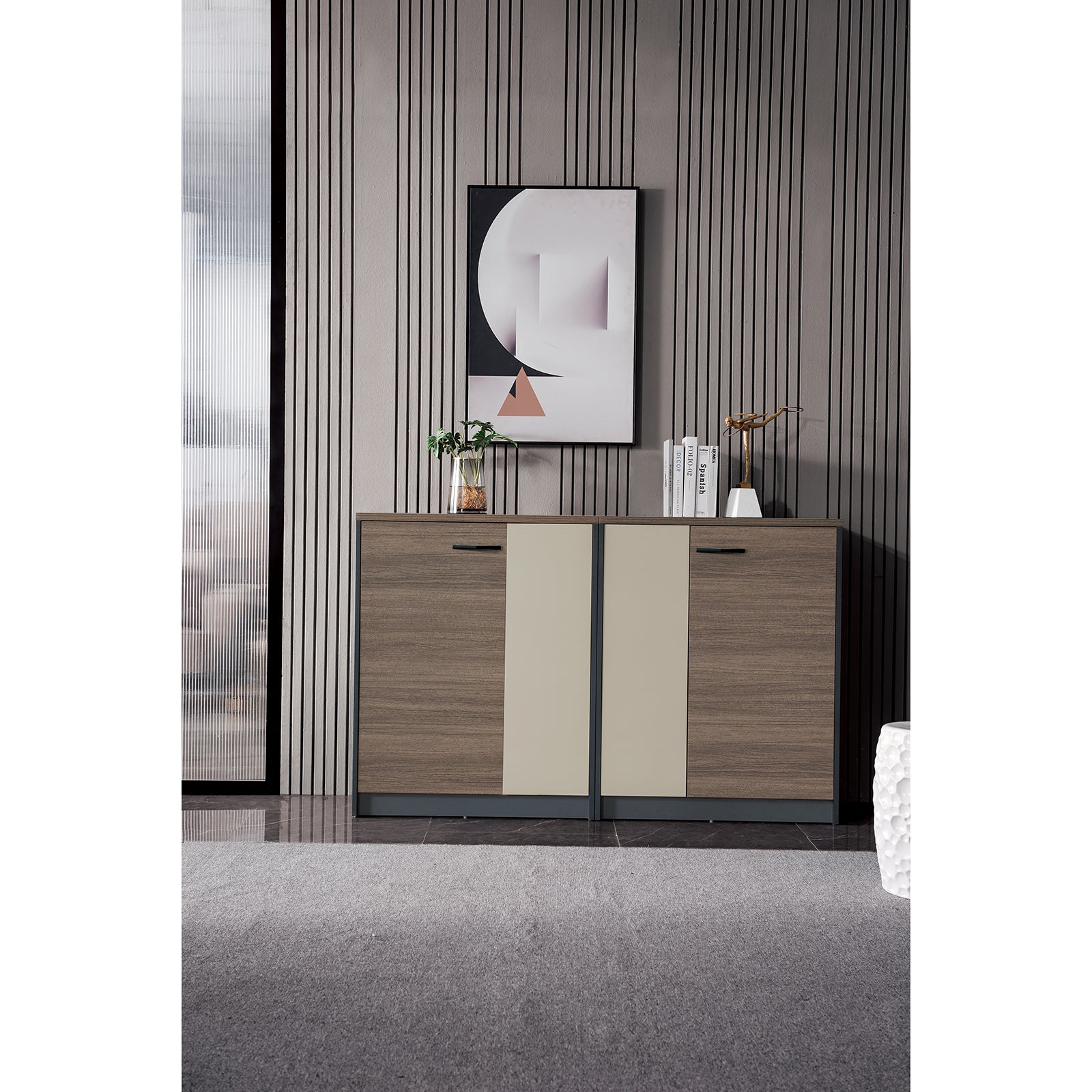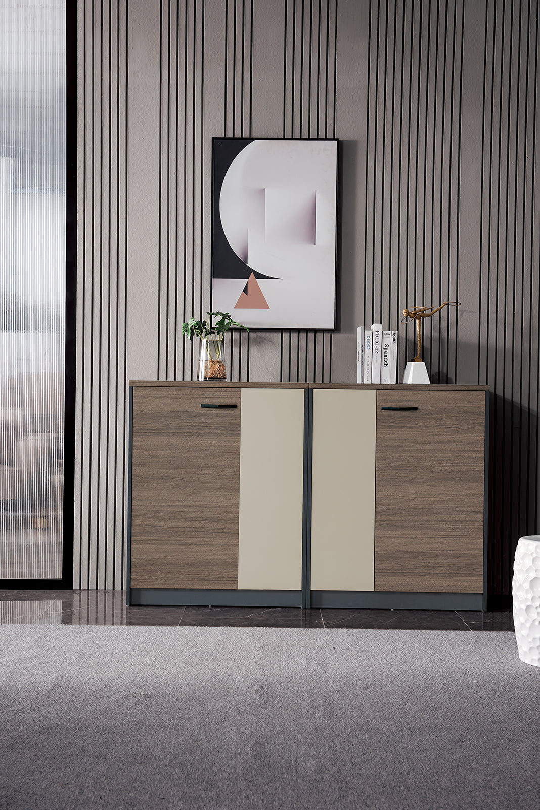 - CONCEALED SHELVES: The low cabinet’s two door design allows easy access while also keeping the contents of the storage spaces tidy, organized and hidden from view.